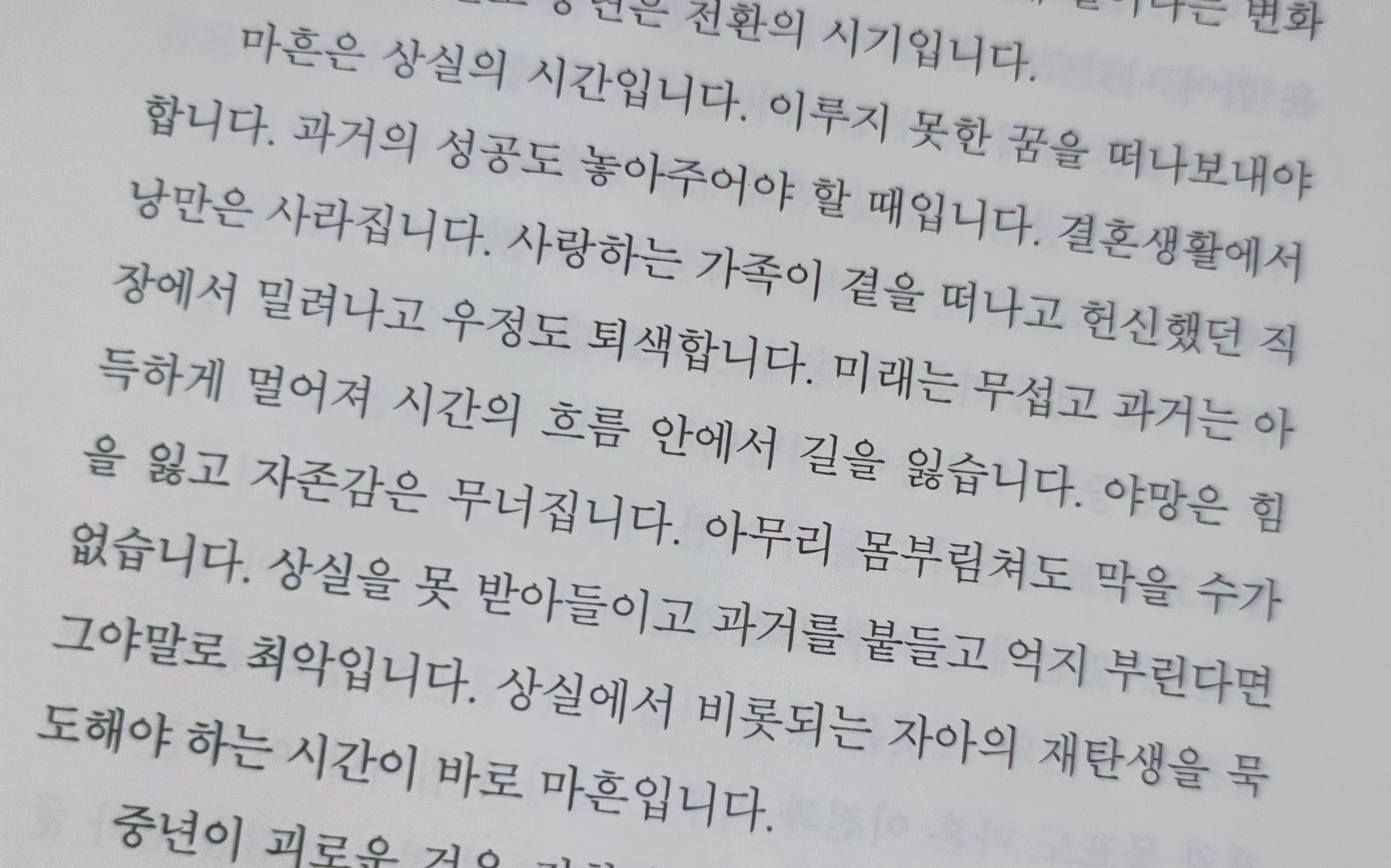 한없이 약한 나도 여물어 질까. 아직은 확신이 없지만 받아들이고 마음의 훈련을 해서 인생 후반부에 길을 잃지 않고, 내 삶의 주도권을 찾고 살아갈 수 있기를 기원해 봅니다. 너무 힘들고 너무 지치고 모든 것이 내가 상상했던 그 무엇이 아니고 마음이 요동치시면 이 책 꼭 한번 읽어 보시면 좋겠습니다. 저도 힘들 때마다 다시 읽고 있거든요.