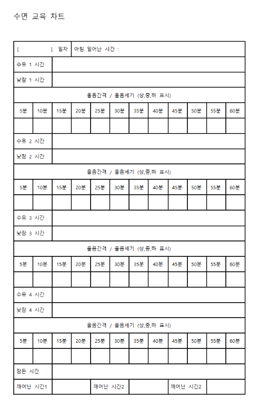 수면교육을 할 때 사용했던 기록지가 있습니다. 아이의 패턴을 알기 위해 제가 쓰기 좋게 조금 바꿔 만들어서 사용했어요.