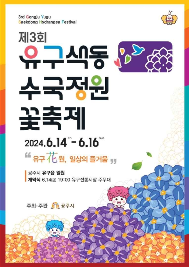 올해 축제는 6월 14일(금)부터 6월 16일(일)까지 충청남도 공주시 유구읍 창말길 44 유구색동수국정원에서 개최됩니다.